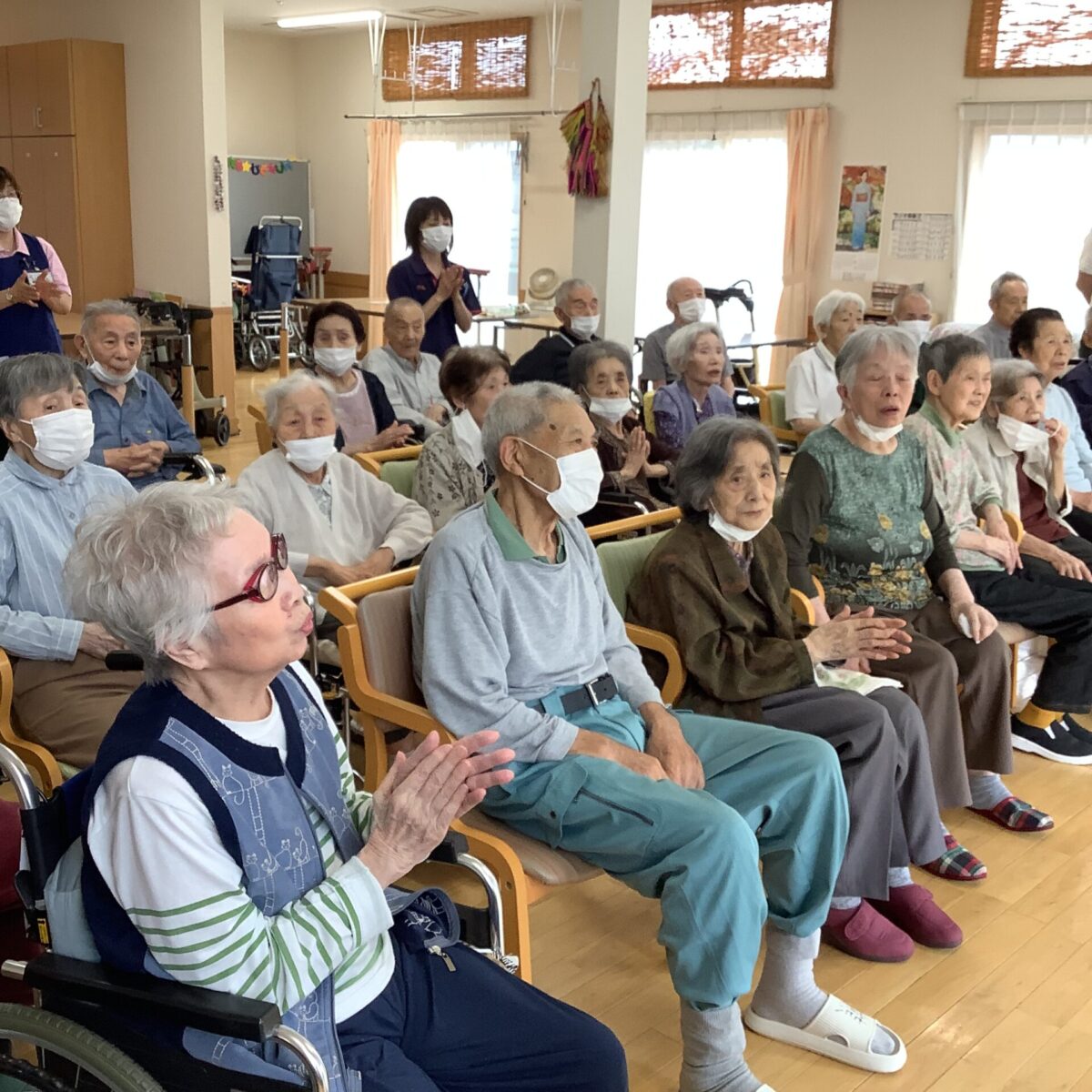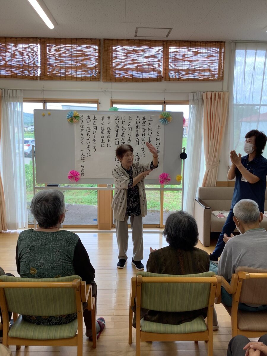 レクリエーションとして「上を向いて歩こう」と「三百六十五歩のマーチ」、「ドンパン節」等を合唱し、踊りました。