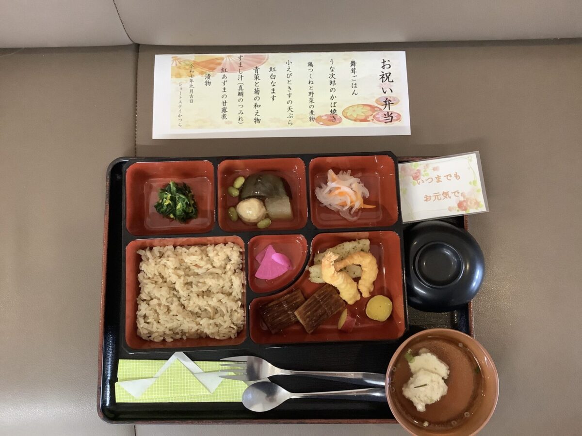 お昼はお手製のお祝い弁当です。舞茸ごはんや天ぷら等、豪華なお昼に舌鼓を打ち、皆さんの笑顔が溢れました。
