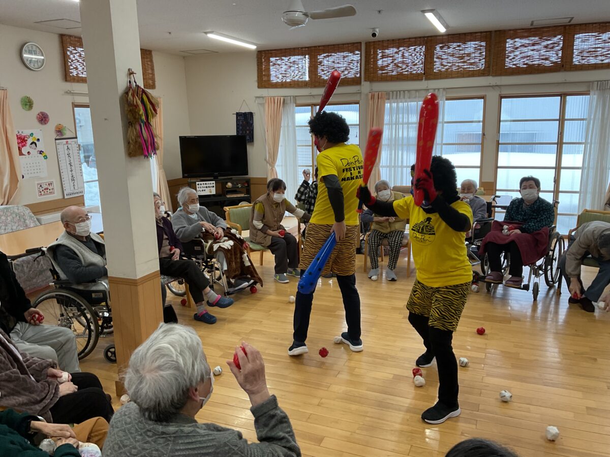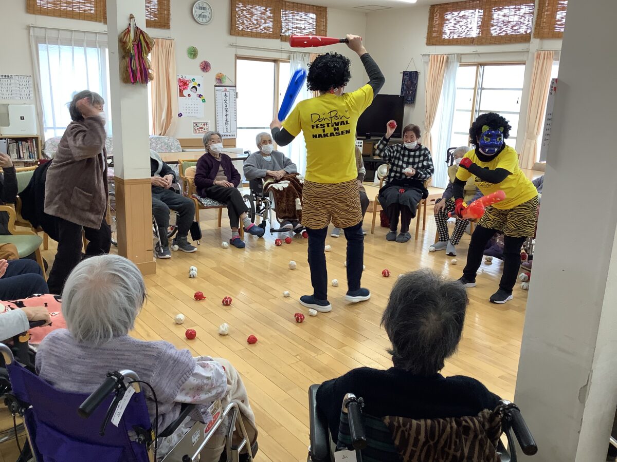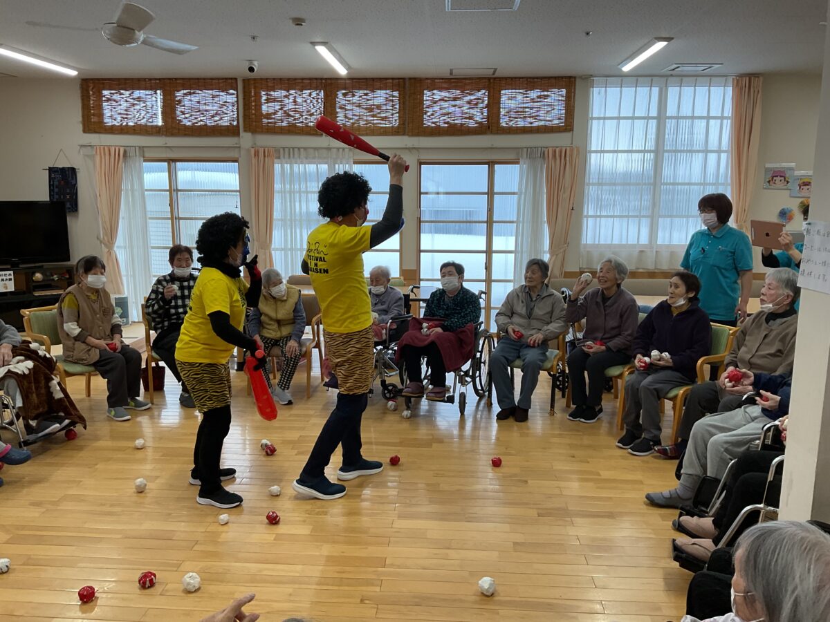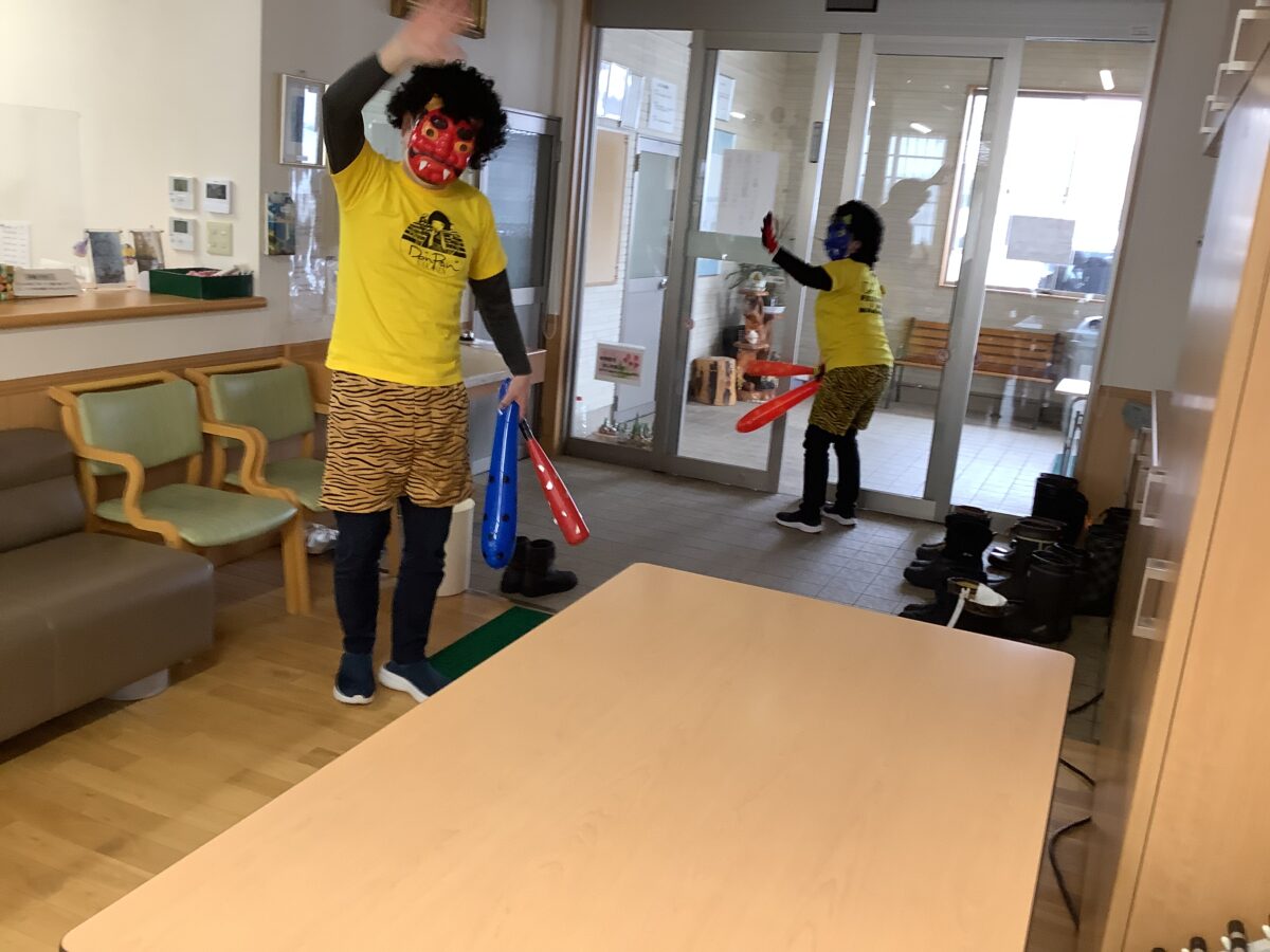 午後からは、鬼に扮した職員が登場し、節分恒例の豆まきならぬ“紅白のボール投げ”を行いました。鬼が現れると驚きつつも、「それっ!」と元気な掛け声が飛び交い、力いっぱいボールを投げて鬼退治を楽しまれました。最後には鬼も無事退散し、拍手と笑顔に包まれるひとときとなりました。