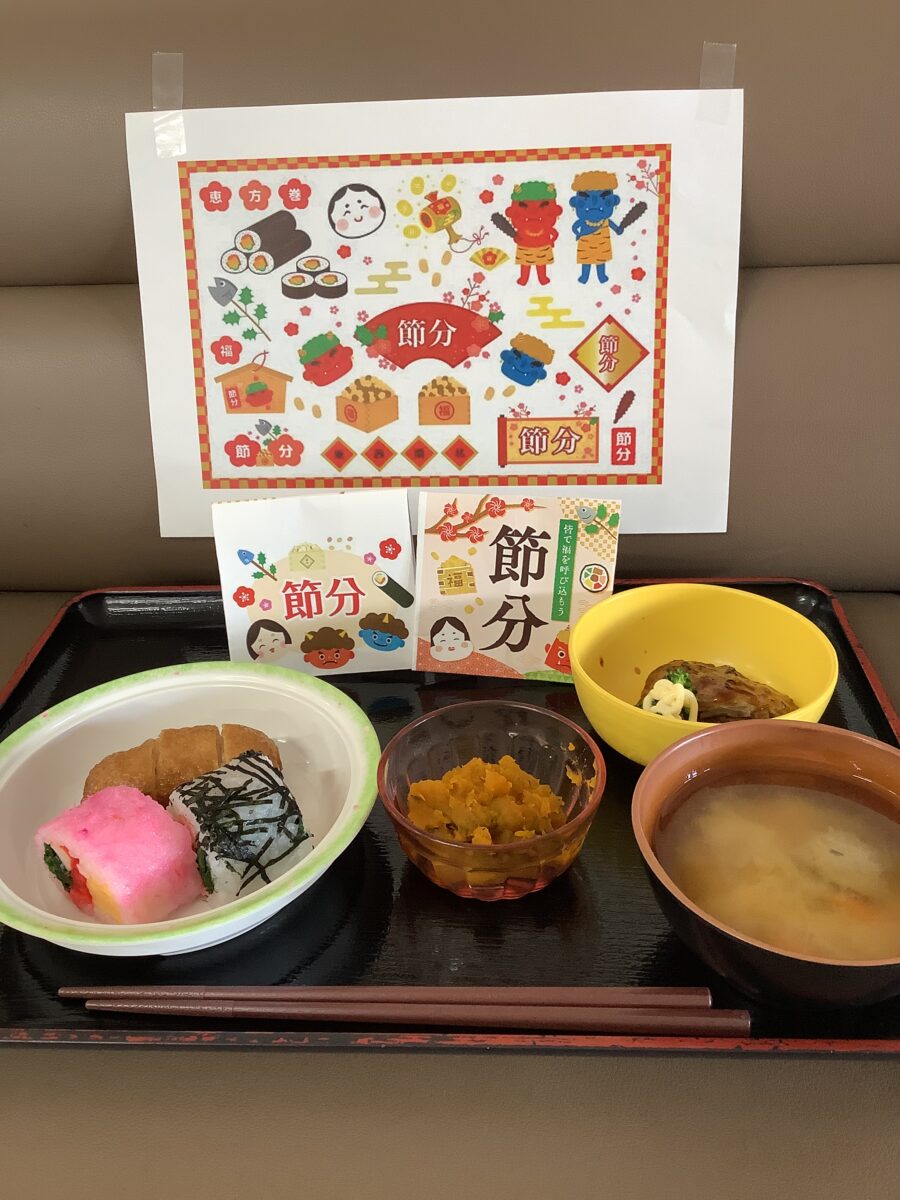 お昼ごはんには、恵方巻に見立てた食べやすい海苔巻きをご用意し、「今年の恵方はあっちだそうだよ」「きれいでおいしそう」と会話を弾ませながら、皆さま笑顔で召し上がっていらっしゃいました。