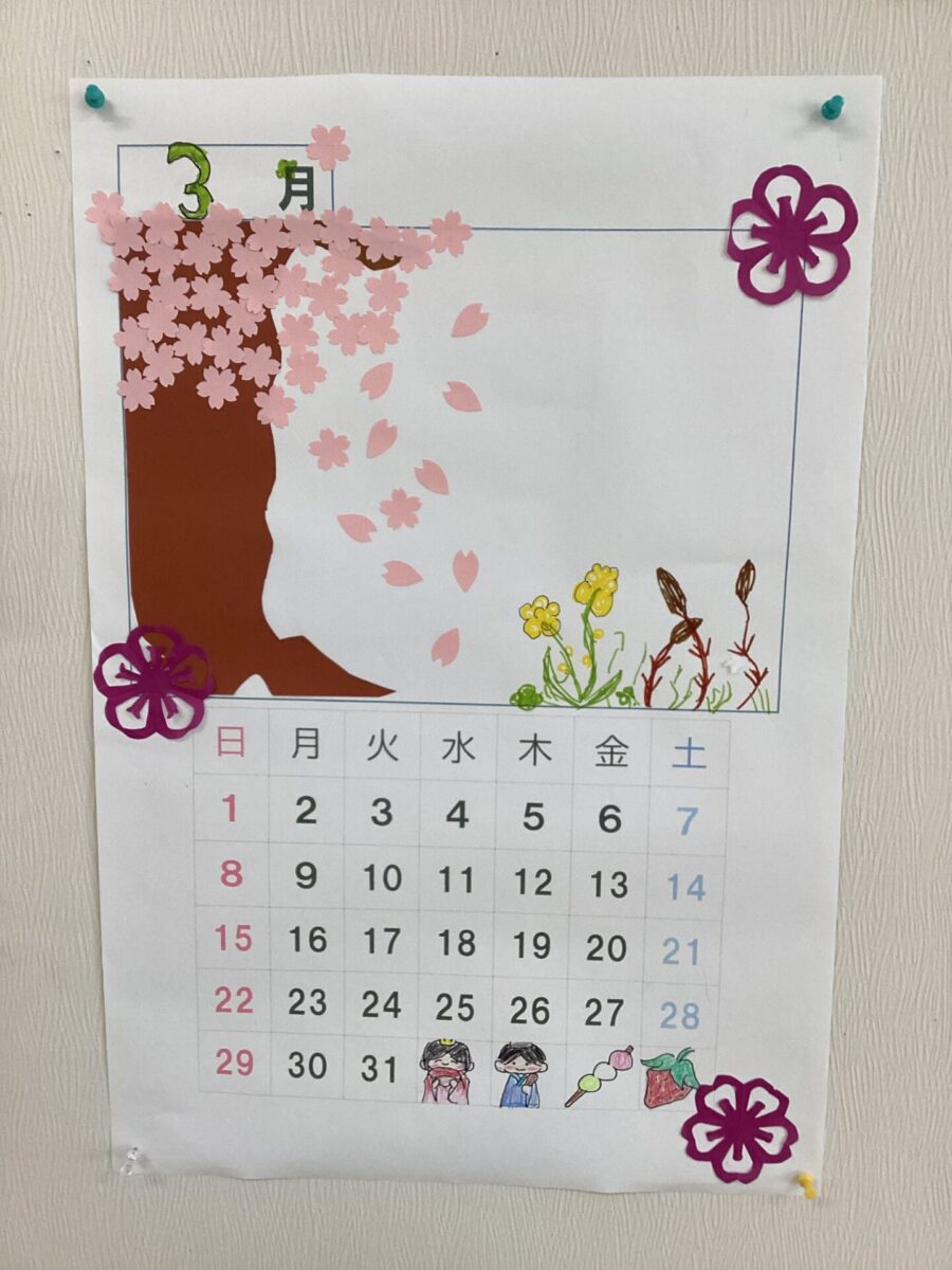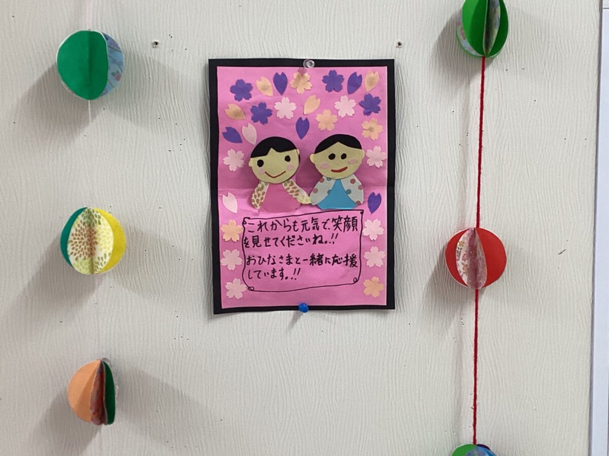 施設内には立派なひな人形を飾り、皆さま「きれいだな」「おらえでも飾った」と懐かしそうに眺めていらっしゃいました。お内裏様とお雛様のお顔を見ながら、自然と笑顔がこぼれ、穏やかな時間が流れていました。